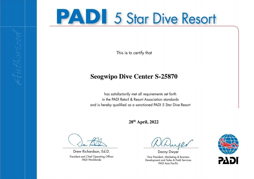 서귀포 다이브센터는 공인된 PADI 5 STAR